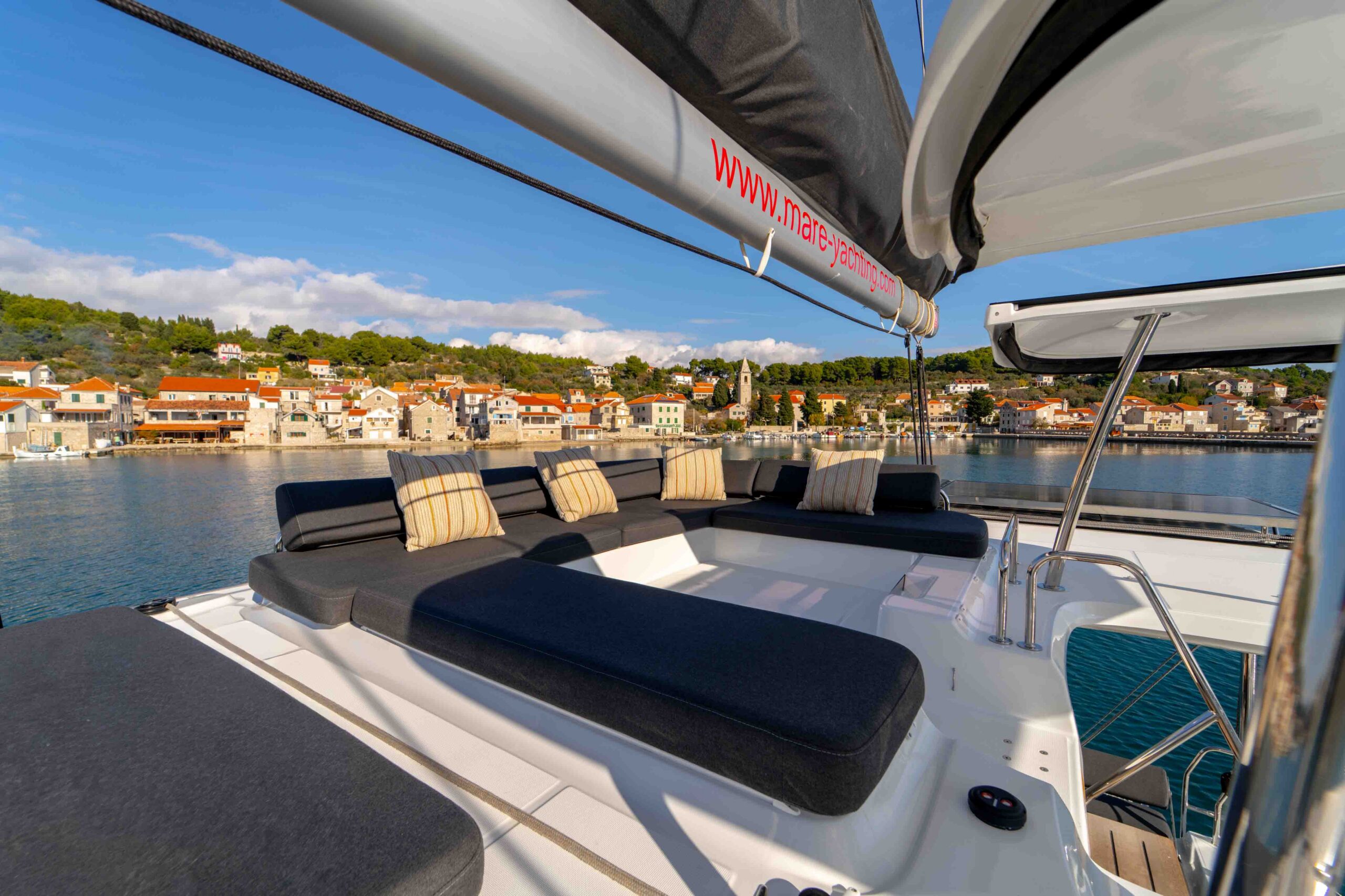 Die Lotti ist mit allem erdenklichen Komfort ausgestattet wie Generator, Klimaanlage, Wassermacher, großen Kühlschränken, Unterwasserbeleuchtung, Solarpanelen, großem Dinghy mit Steuerstand und zahlreichen Liege- und Sitzflächen.