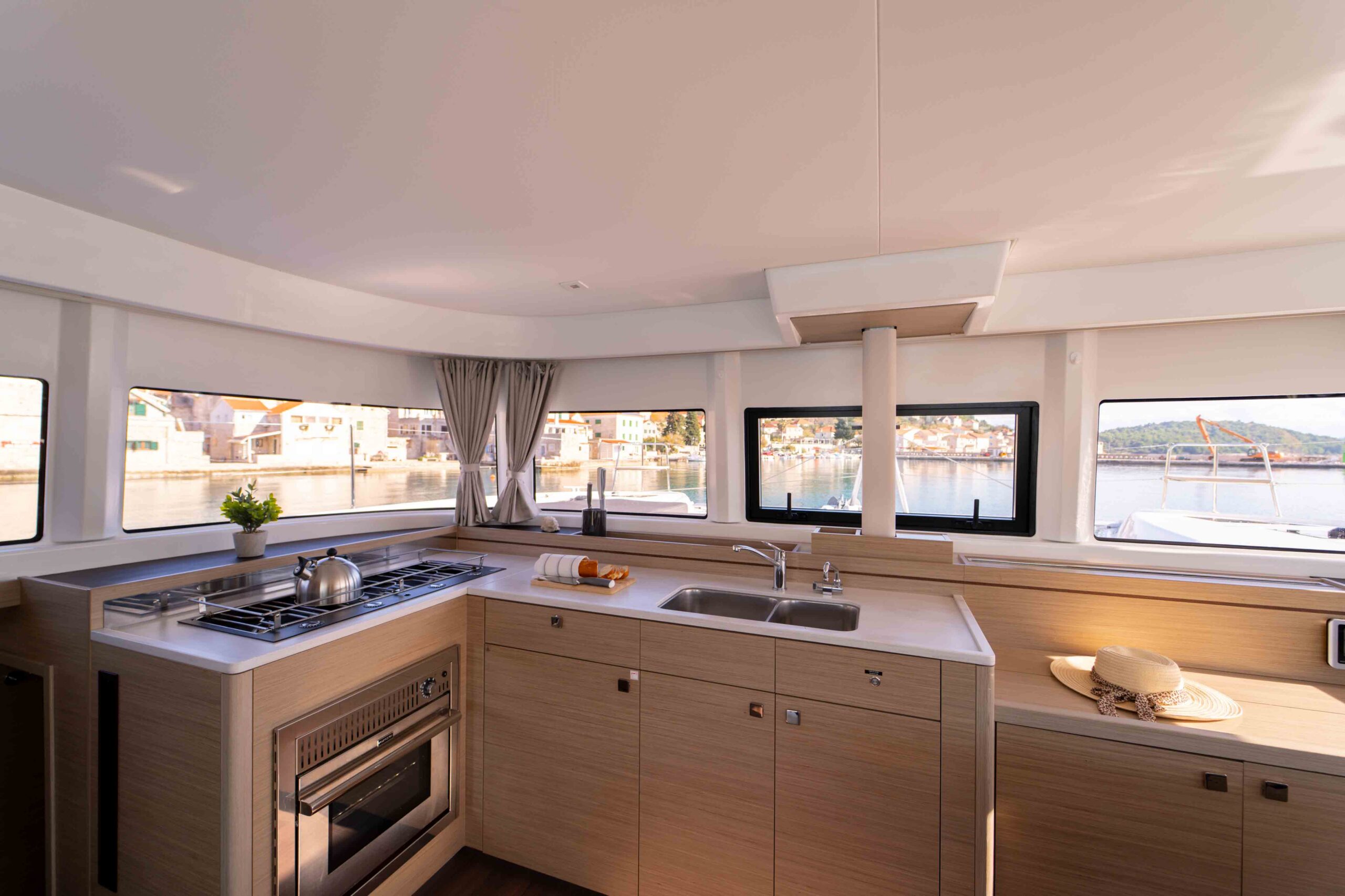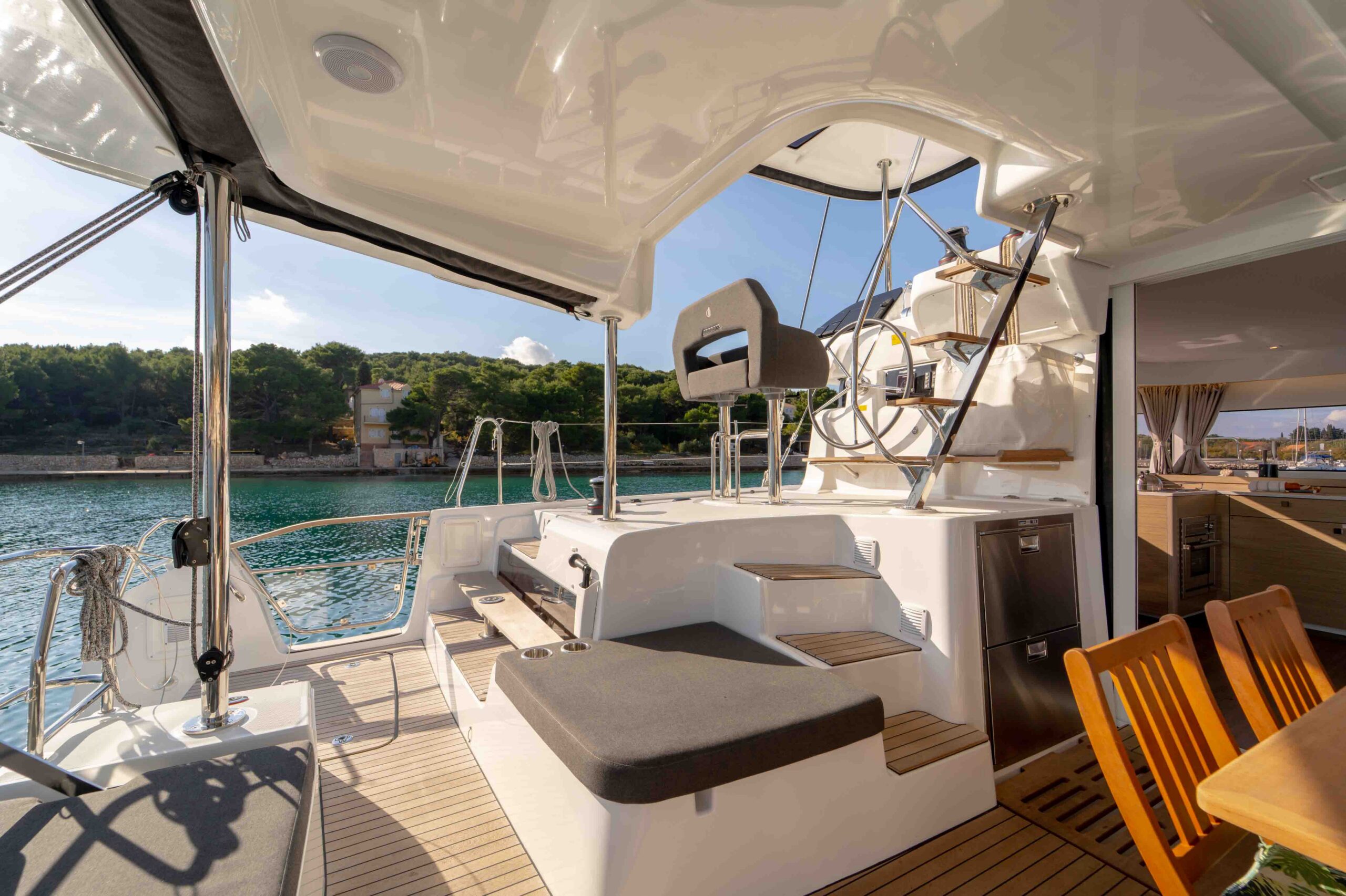 Die Lagoon 43 ist als ein vielseitiges Boot mit verschiedenen Lebensräumen konzipiert. Je nach Bedarf können Innenraum und Außenraum zusammengeführt oder getrennt werden. So entsteht bei Bedarf ein Esstisch, an dem bis zu 12 Personen Platz finden können.